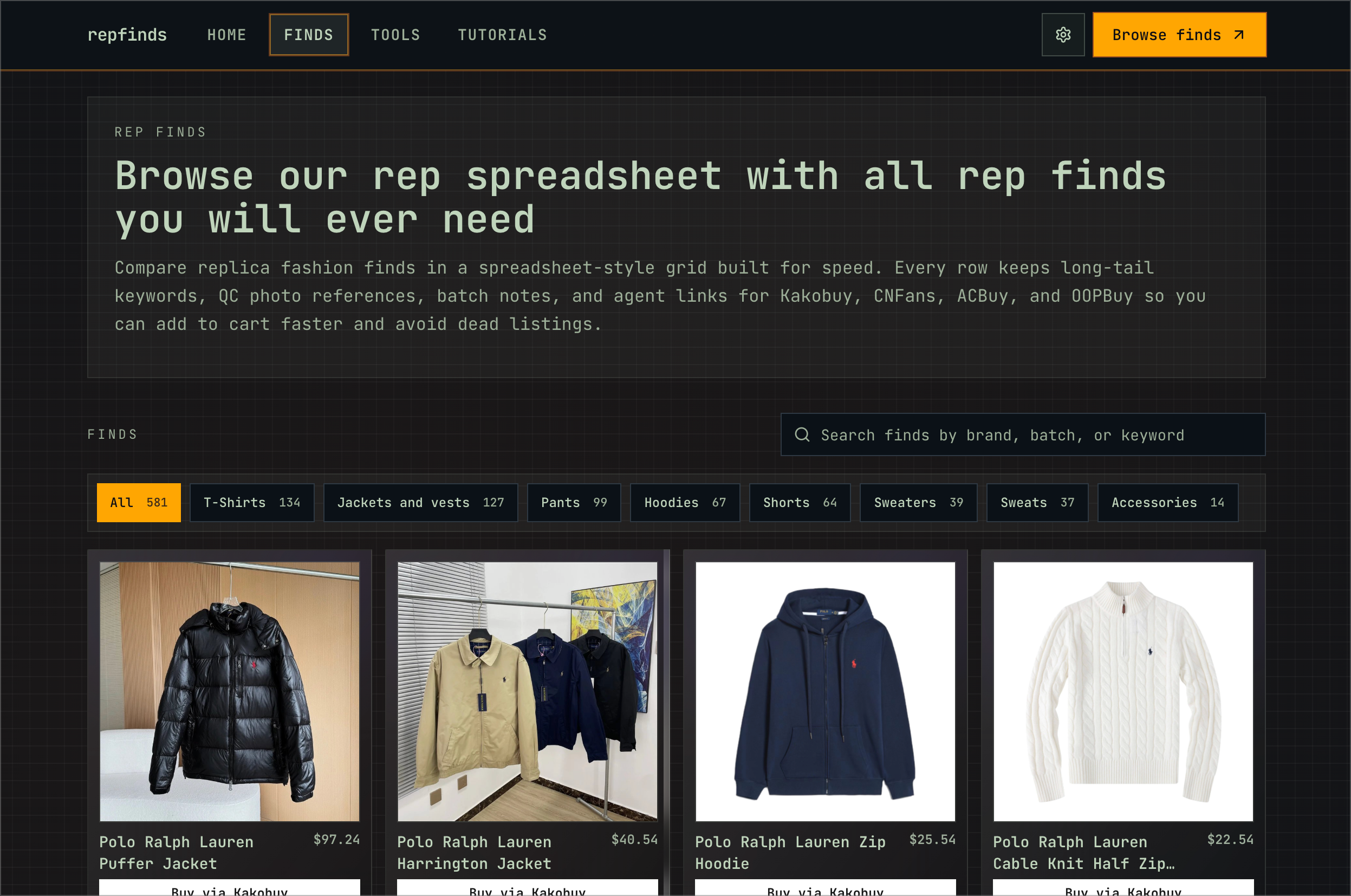 Classic rep finds website with an agent selector and currency picker—SEO-optimized for fast discovery and clean browsing.